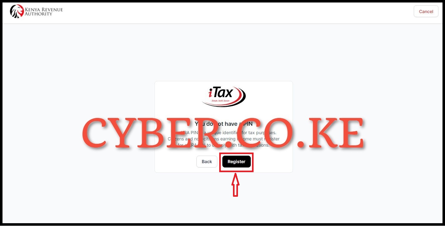 In this step, you will see a message window on the url: “https://ecitizen.kra.go.ke/individual/pin-registration/no-pin” telling you that you don’t have a KRA PIN Number. Your KRA PIN is a unique identifier for tax purposes. Citizens and non-citizens earning income must register for a KRA PIN to comply with tax regulations. Click on the “Register” button to begin the process of applying for a new KRA PIN using eCitizen account.