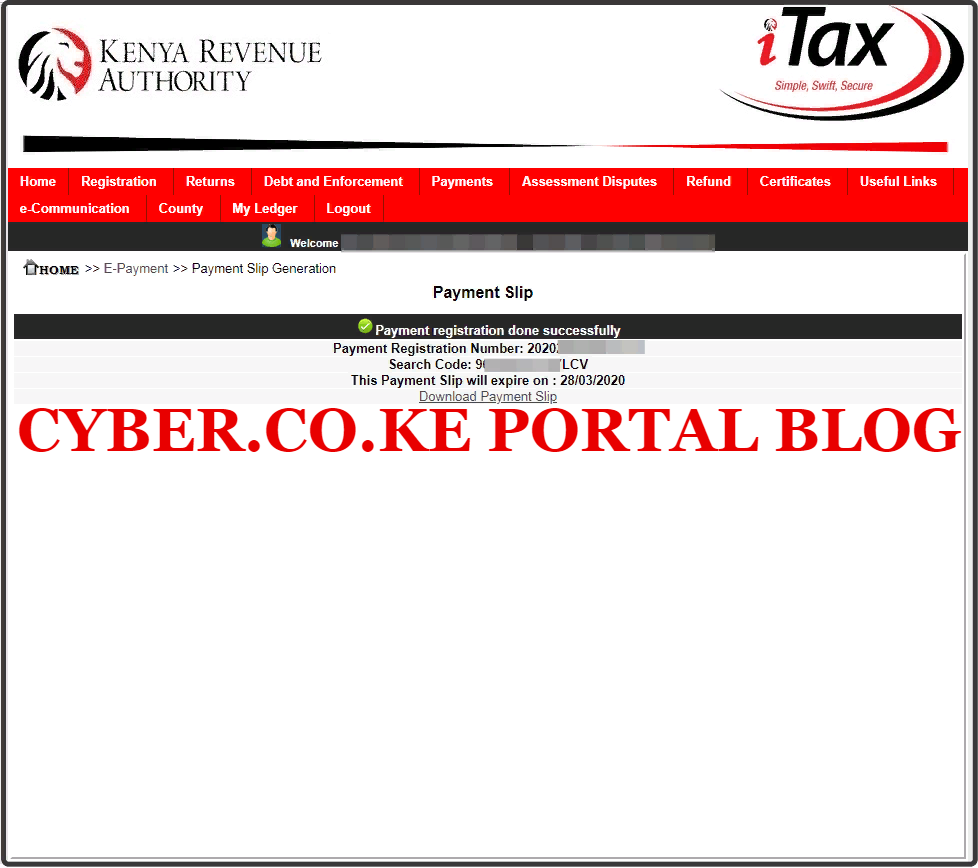 In this last step, you will need to download the KRA Presumptive Tax Payment Slip that has been generated successfully by the iTax Portal for your business. You do this by clicking on the “Download Payment Slip” link. This is as shown below.